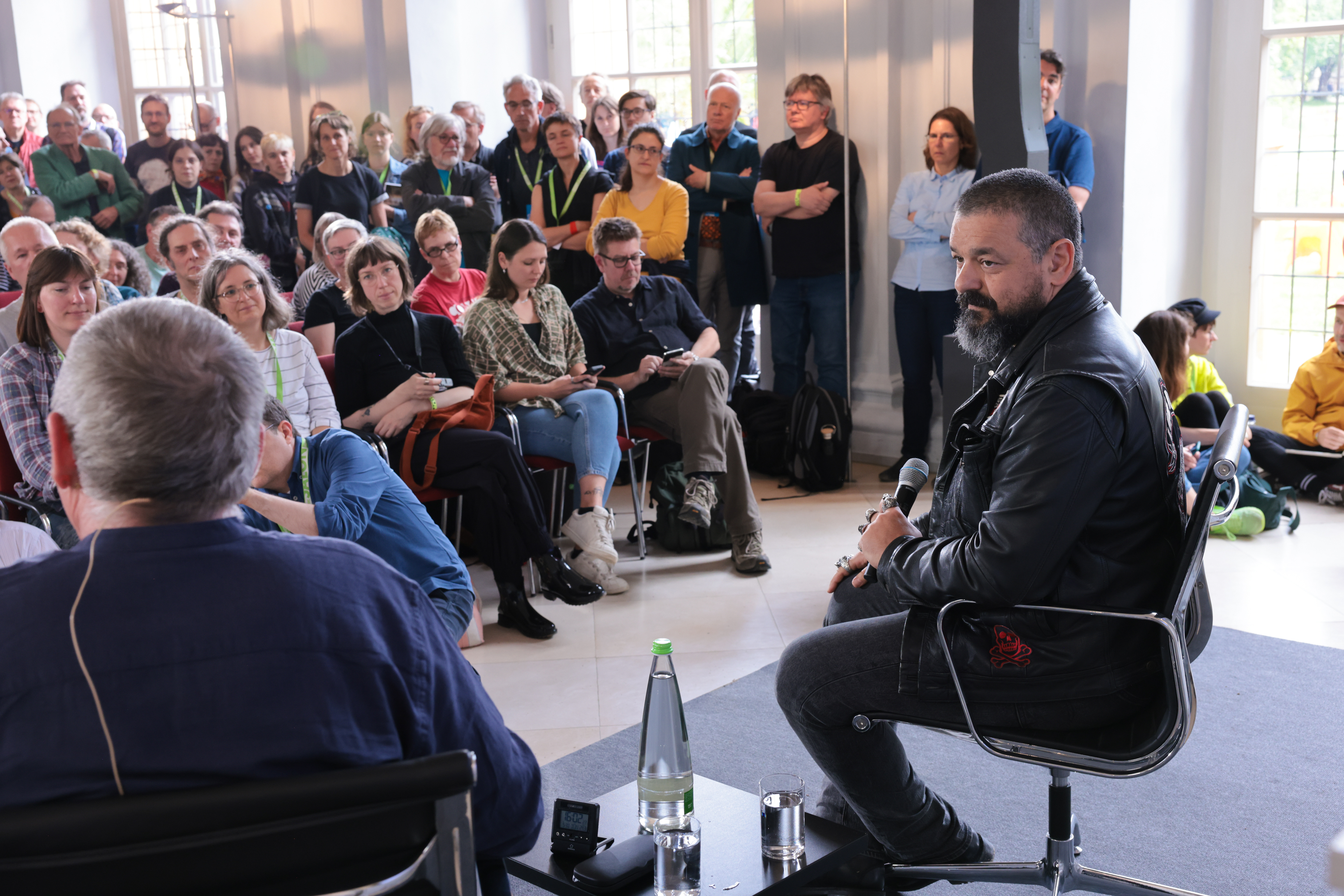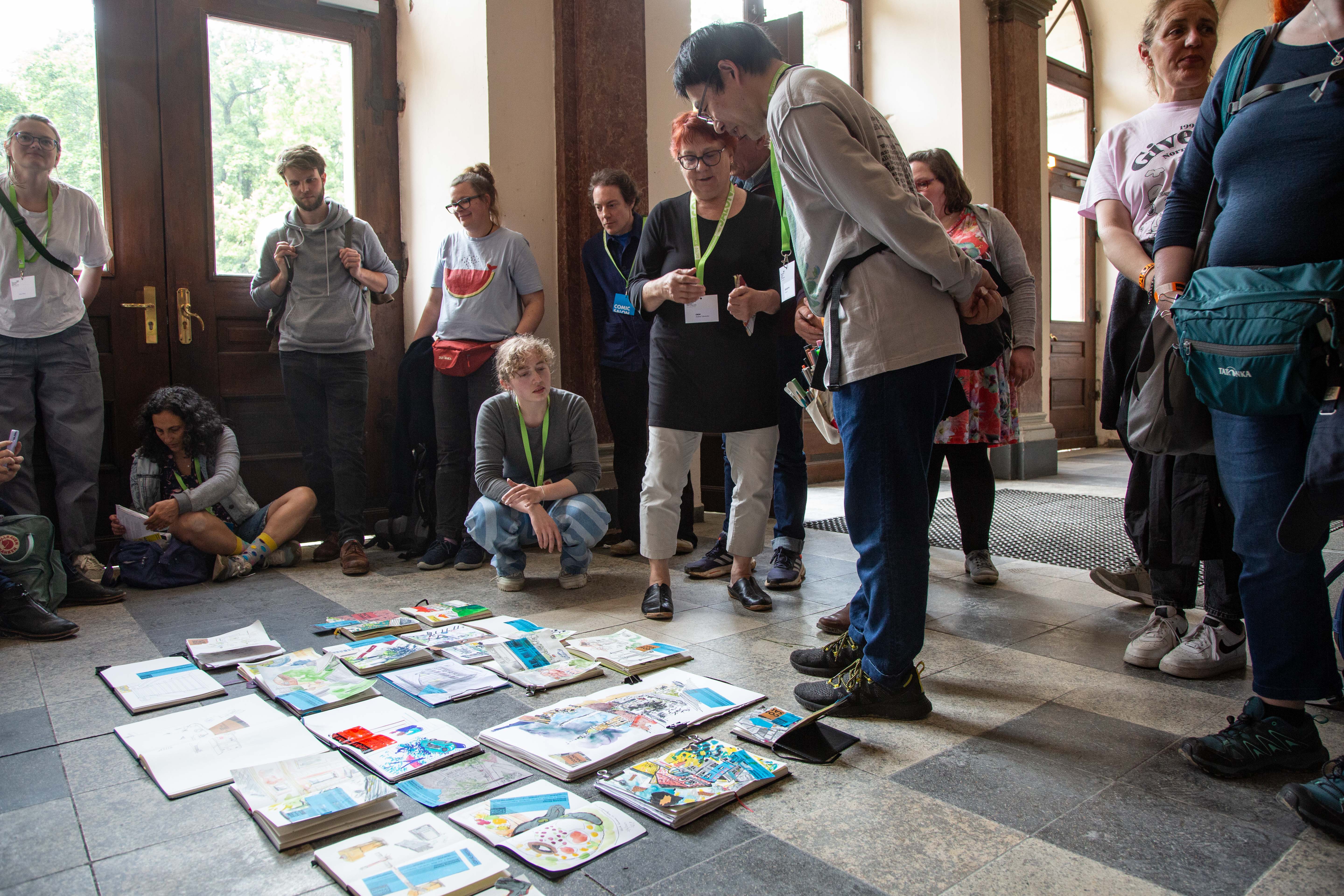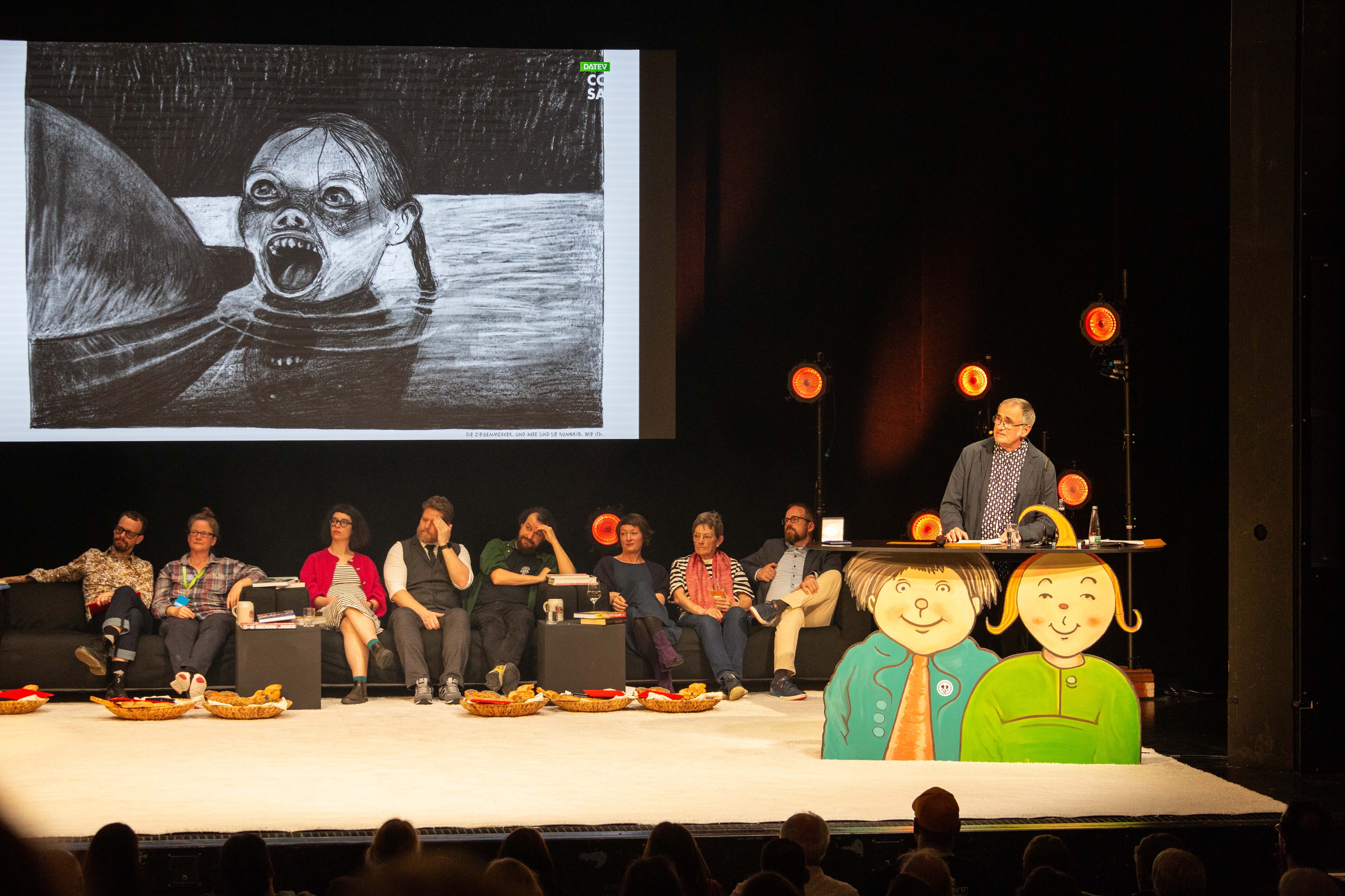Wie geht es dir? Zeichner*innen gegen Antisemitismus, Hass und Rassismus Gespräch mit Hannah Brinkmann, Nathalie Frank, Michael Jordan, Julia Kleinbeck, Moritz Stetter, Véronique Sina, Birgit Weyhe und Barbara Yelin; Moderation: Lars von Törne Copyright: Internationaler Comic-Salon Erlangen – Foto: Erich Malter, 2024