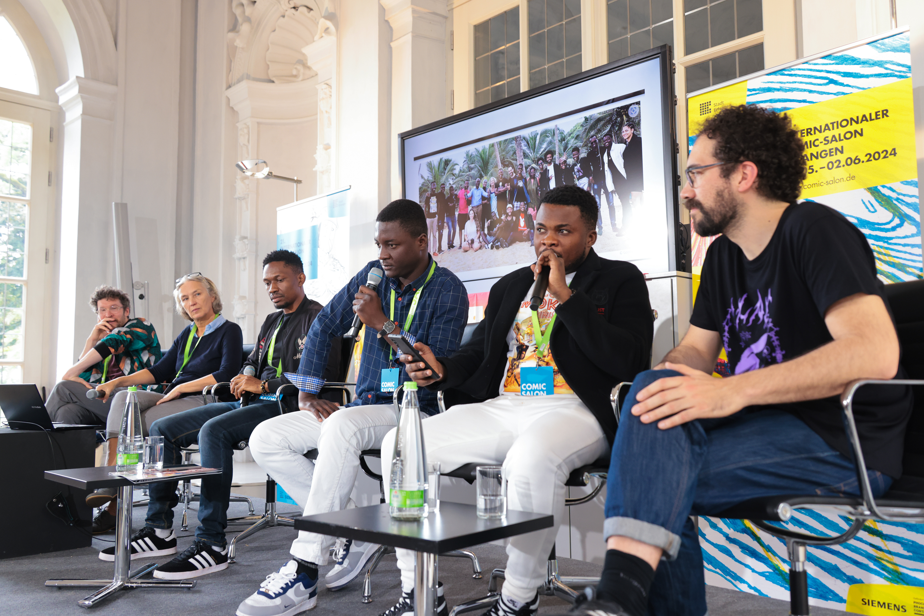 AfriComics – Perspektiven der Zukunft Gespräch mit Sebastian Lörscher, Patrice Mballa Asse, Gloria Muluku Mbatu und Mikael Ross; Übersetzung Deutsch/Französisch: Joël Messou; Moderation: Heike Friesel Copyright: Internationaler Comic-Salon Erlangen – Foto: Erich Malter, 2024